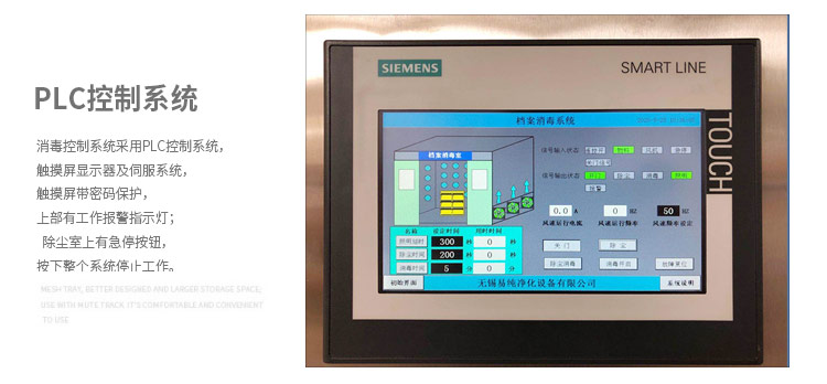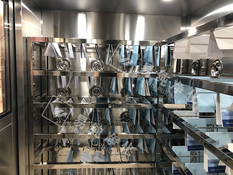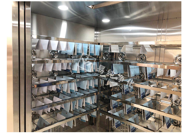 工作原理介紹:檔案消毒除塵室采用全不銹鋼材質制作,進門為自動感應雙側是移門,人員觸碰按鈕后開門,將托盤送入到除塵室內,人員退出后關閉自動門,當門關閉后,除塵室內啟動風淋除塵,此時自動門鎖閉,工作報警指示燈顯示為紅色狀態,門無法打開。當除塵時間到達后,報警指示燈顯示為綠色并發出報警聲音,門為可開狀態。人員取出托盤,將之送入到庫房內進行保存。