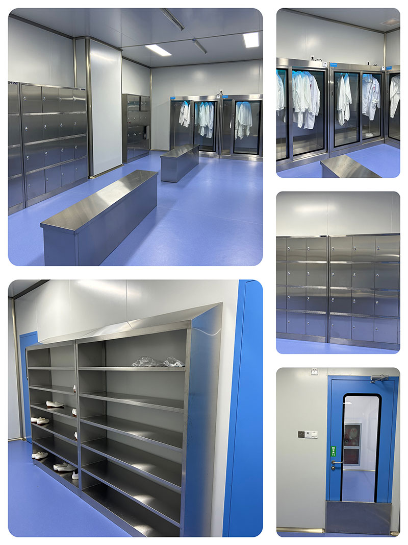 更衣室入口設(shè)置門(mén)禁和擋鼠板,內(nèi)部不銹鋼鞋柜和衣柜,二更內(nèi)配紫外線消毒衣柜